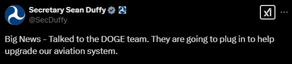 美國交通部部長肖恩·達菲也證實這一消息,稱馬斯克的團隊將“參與幫助升級美國航空系統”。