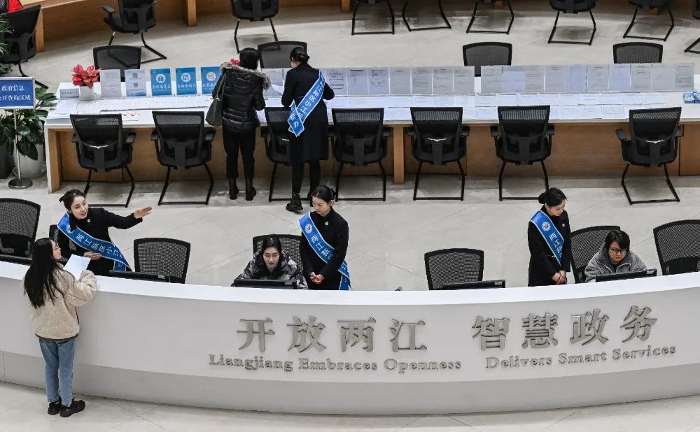 ▲2月5日,兩江新區政務大廳,“小江幫辦”人員正在指導辦事羣眾填報材料。首席記者 龍帆 攝/視覺重慶