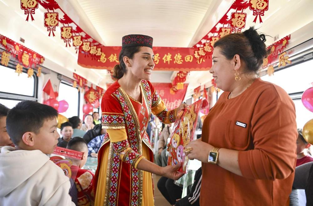 在喀什開往成都西的列車上,艾爾開牙·多力開(左)向參與“列車春晚”互動遊戲的乘客贈送福字年畫(2025年1月17日攝)。