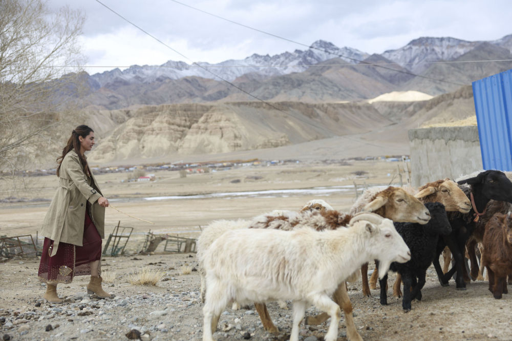 在瓦恰鄉夏布孜喀拉村,艾爾開牙·多力開幫忙將羊羣趕回羊圈(2024年3月22日攝)。
