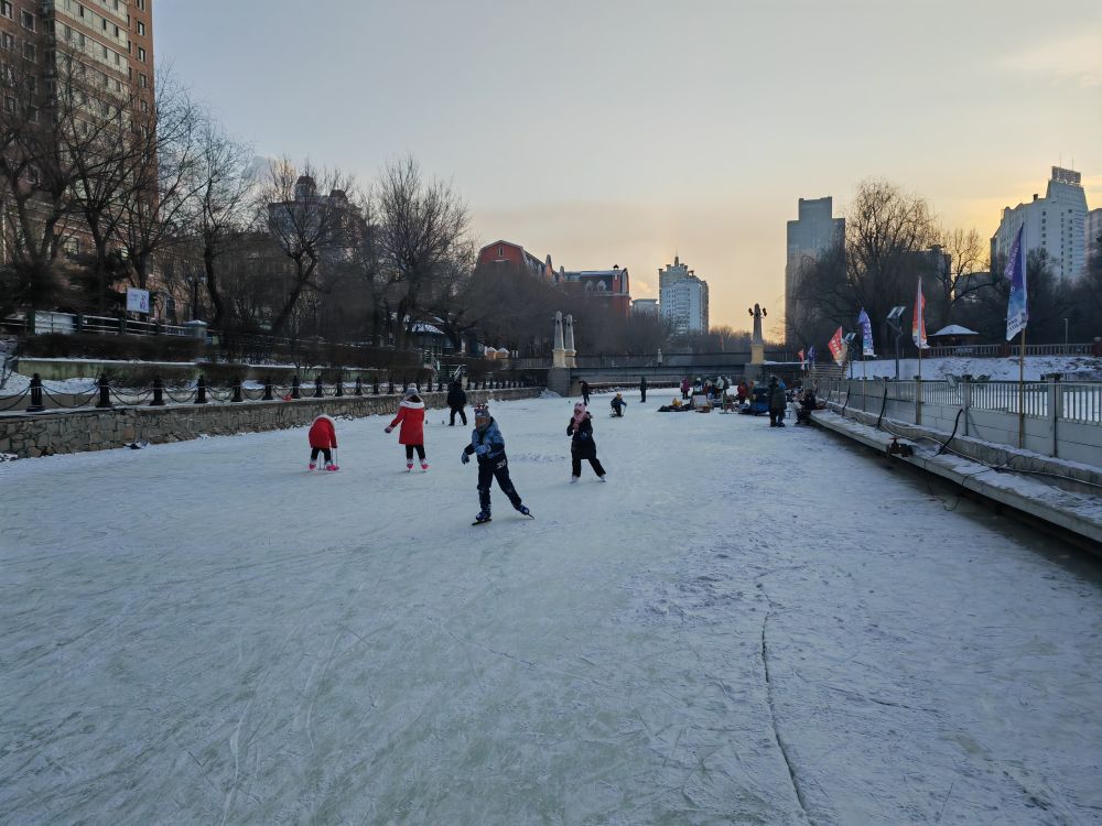 除了大名鼎鼎的松花江,哈爾濱老城區有條小河穿城而過,名叫馬家溝。沿着這條河走一段,你可能會發現這裏冰雪運動如此蓬勃發展的秘密。河面上大片大片的雪被清掃掉,露出長寬幾十米的平整冰面。而附近的孩子大人,拎着冰鞋和小馬紮下到河面,坐在小馬紮上把鞋一換,就在這裏滑冰,一滑就是半天。