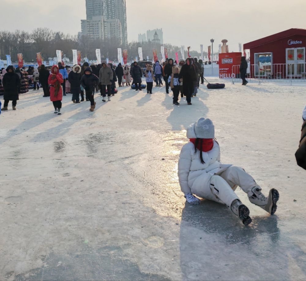 不過,無論哪種表現,他們與冰面大面積接觸的概率都差不多,只不過前者趴在冰上,後者往往摔得四仰八叉,結果引來的都是一串“hàhàhàhà”的爆笑。全副武裝的遊客也不會摔疼,給周圍路人帶來的歡樂卻是實打實的。遊客第一次摔,往往站起來拍拍屁股,擠出一些羞澀的笑;兩次三次過後,那就輕車熟路了,嘴角往往比人還先站起來。