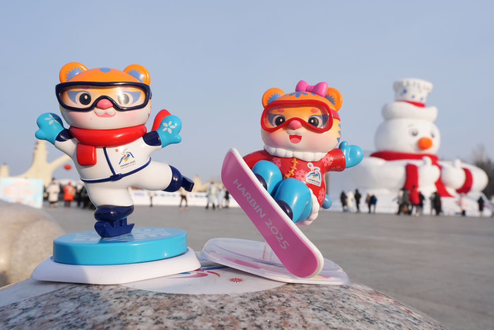 這是2月1日在第37屆太陽島國際雪雕藝術博覽會拍攝的哈爾濱亞冬會吉祥物“濱濱”和“妮妮”。新華社記者 王松 攝