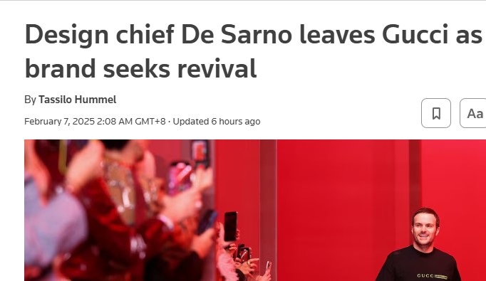 42歲的意大利極簡主義者德薩諾於2023年接替時尚界傑出人物亞歷山德羅·米歇爾(Alessandro Michele)擔任Gucci首席設計師。米歇爾以其熱情洋溢、俏皮活潑的設計風格在Gucci統治了長達七年之久。德薩諾的離職消息在Kering集團公佈全年業績前不到一週的時間點宣佈,對市場產生了一定影響。受此消息影響,Kering集團股價早盤下跌約3%,但隨後受奢侈品同行Tapestry(TPR.N)業績樂觀的提振,收盤上漲3%。