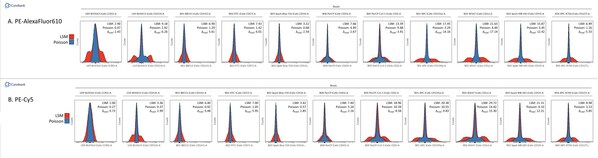 CytoFLEX mosaic採用獨特的泊松算法,並對其進行改進,兼顧解析能力和解析速度。當採用LSM算法和泊松算法解析同一組數據,改進的泊松算法解析的數據產生的spread比LSM算法得到的更小,從而獲得更高的檢測分辨率。