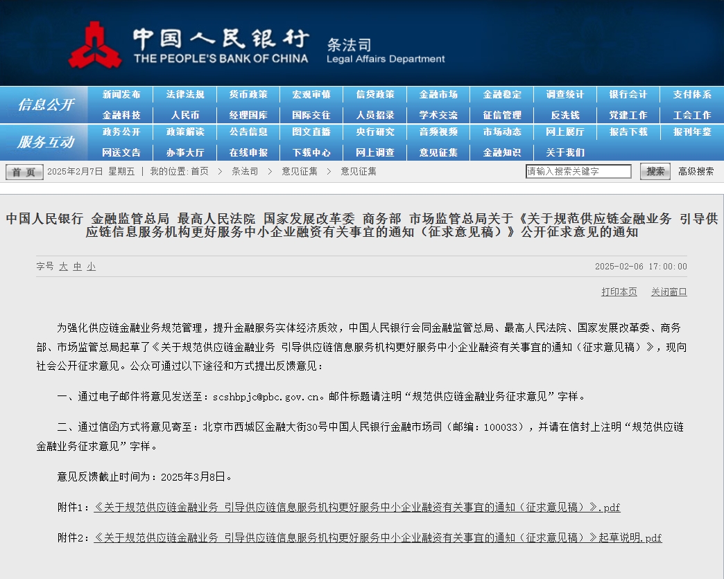 【環球網財經綜合報道】據中國人民銀行2月6日官網消息, 為強化供應鏈金融業務規範管理,提升金融服務實體經濟質效,中國人民銀行會同金融監管總局、最高人民法院、國家發展改革委、商務部、市場監管總局起草了《關於規範供應鏈金融業務 引導供應鏈信息服務機構更好服務中小企業融資有關事宜的通知(徵求意見稿)》(下稱《徵求意見稿》),現向社會公開徵求意見。