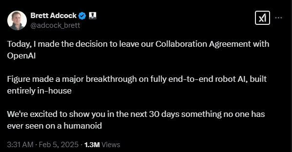 與此同時,此國際知名機器人制造商如Figure和Agility等也已開始加速出貨,進一步推動了人形機器人市場的快速發展。其中,當地時間2月4日,Figure創始人Brett Adcock宣佈,Figure決定終止與OpenAI合作。Figure在全自主研發的、完全端到端機器人AI方面取得了重大突破,未來30天內,公司將向外界展示一項前所未有的、在人形機器人領域中的創新成果。