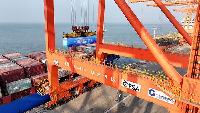 2024年,廣西北部灣港第900萬標箱起吊。陸奇東攝