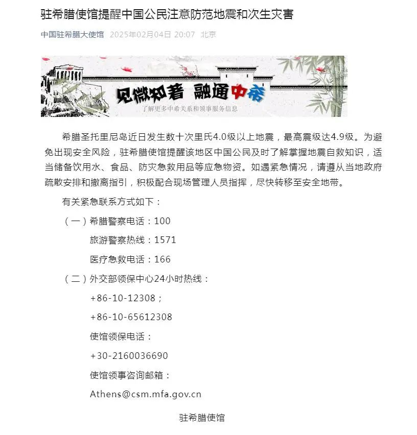 中國駐希臘大使館發佈了相關提醒。網絡截圖
