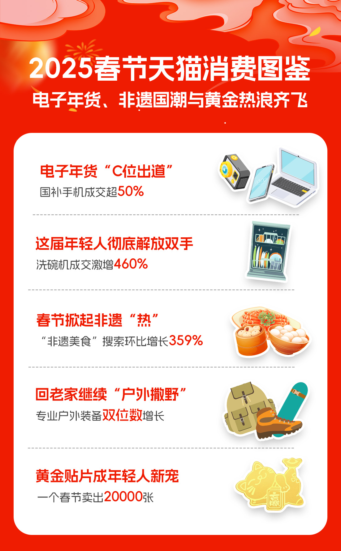 【環球網消費綜合報道】2025年春節假期落下帷幕,消費火熱,年味十足。來自天貓數據顯示,蛇年春節消費市場中,電子年貨、非遺商品、黃金珠寶、户外運動裝備……等紛紛成為今年春節消費新潮中的熱銷爆款。