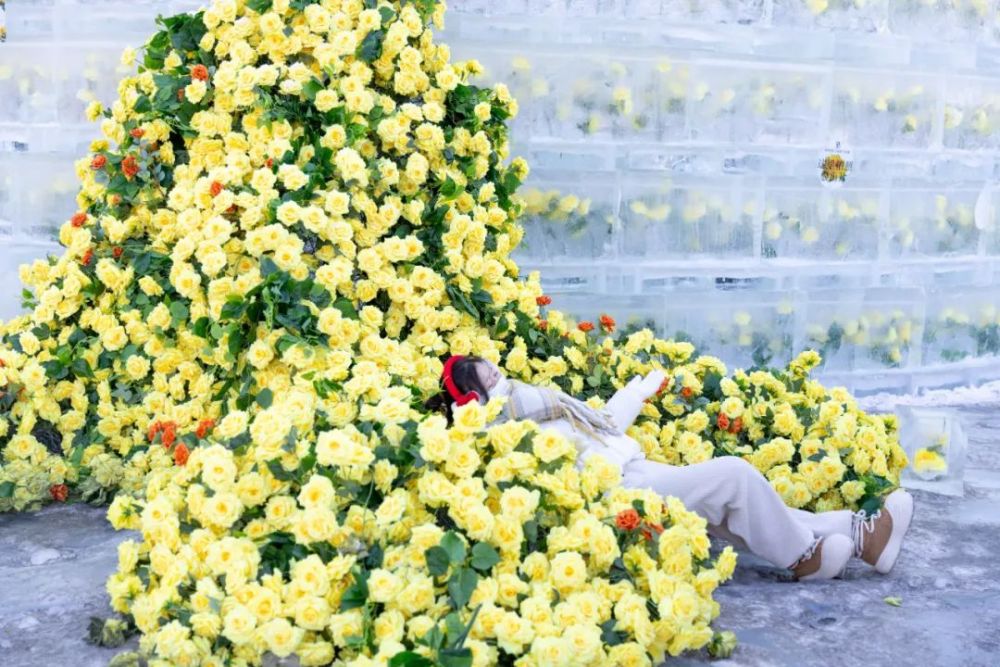 遊客在“冰封黃玫瑰”前拍攝照片。