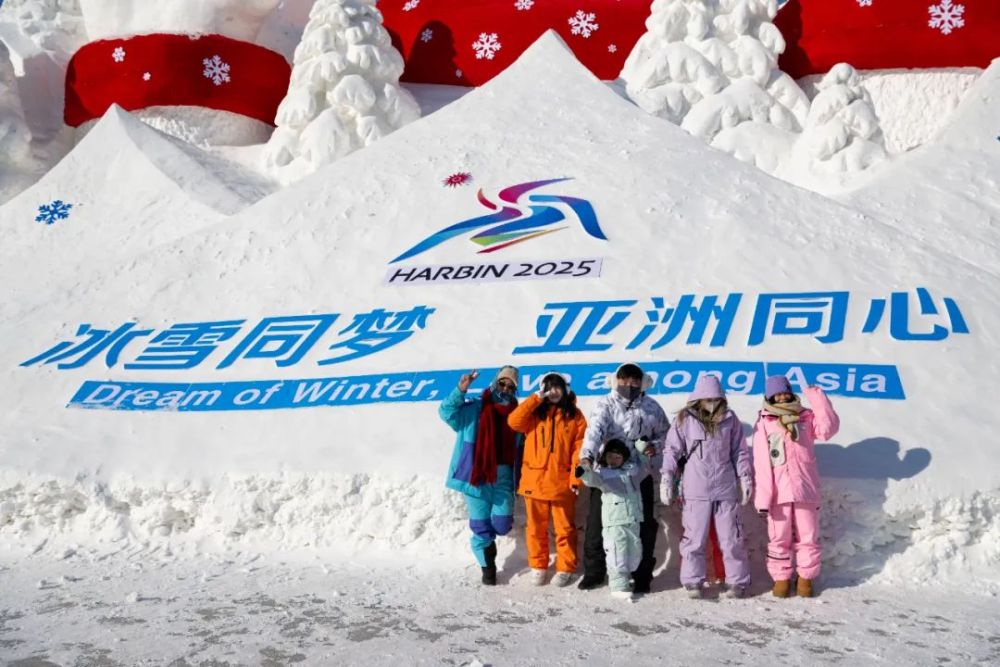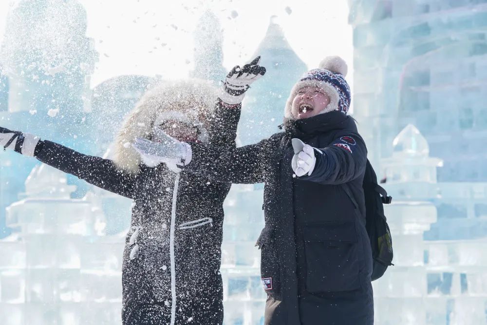 遊客在哈爾濱冰雪大世界園區遊玩。