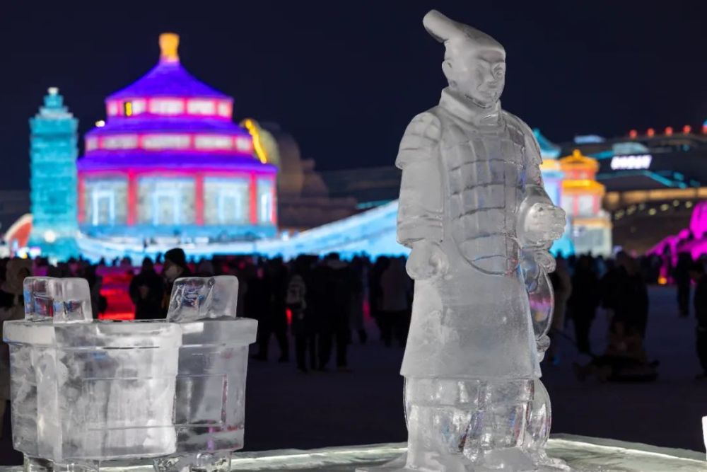 哈爾濱冰雪大世界園區內的“冰馬俑”。