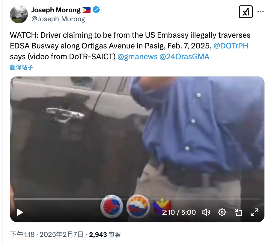 該段視頻由菲律賓GMA新聞網的一位記者於2月7日最先發布在社交媒體X上,這名記者表示,這段視頻來自於菲律賓的交通部門,當天菲方執法人員正在馬尼拉市中心的帕西格區奧提加斯大道進行執法活動,而一名自稱是美國大使館的人員,違規開進EDSA大道的公交專用道。