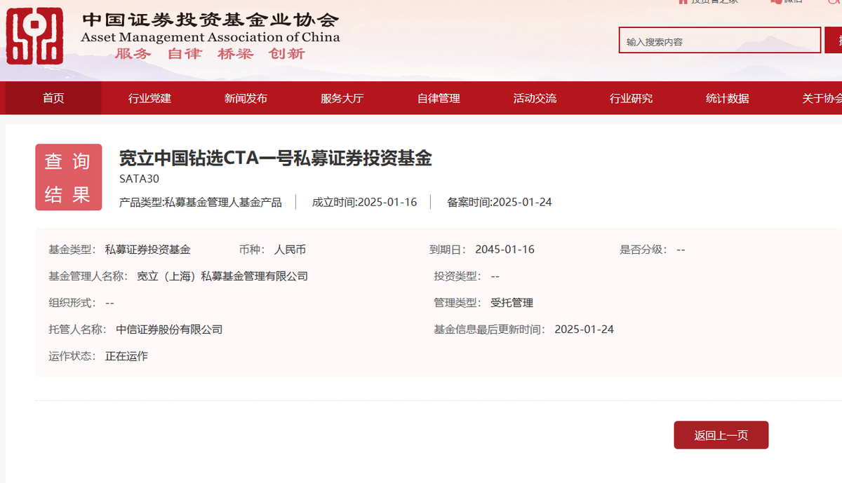 據悉,寬立中國鑽選CTA一號私募證券投資基金於今年1月16日成立,並在不到十天的時間內,即1月24日,便完成了備案。該基金類型為私募證券投資基金,託管人為中信證券。寬立私募基金由寬立資本100%控股,自2024年3月14日成立以來,便積極籌備在中國市場的業務拓展。同年12月13日,寬立私募基金在基金業協會登記為私募證券管理人,註冊資本達2000萬元人民幣。