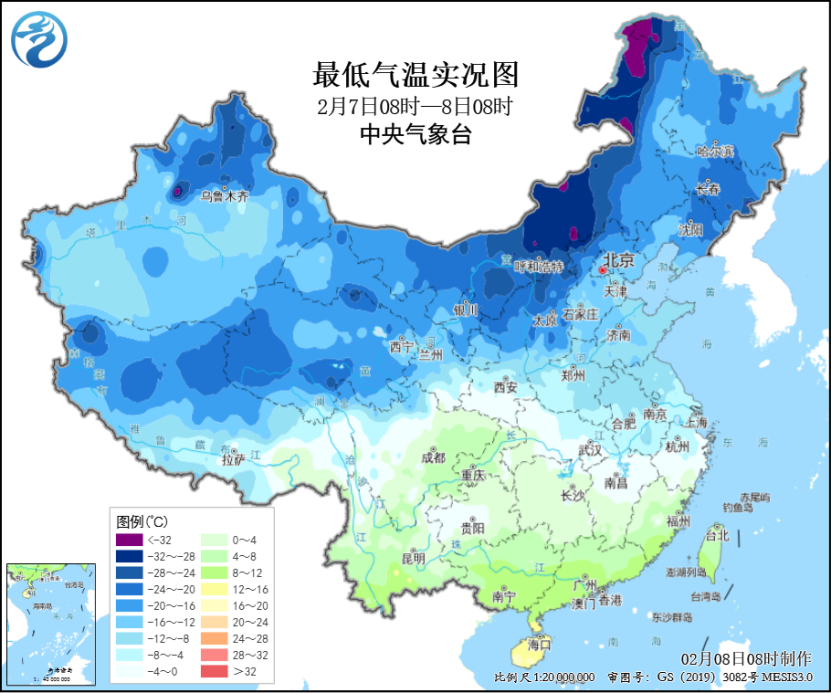 昨日,受寒潮影響,內蒙古中東部、華北、黃淮、江淮、江南北部及青藏高原等地部分地區出現大風天氣,陣風風力有6~9級,內蒙古、北京、河北、山西、山東、浙江及青海、西藏等局地風力達10~12級。同時,北方大部地區經歷入冬以來最冷一天,內蒙古呼和浩特最低氣温-26.5℃。今晨,河南南部、安徽、江蘇中南部、上海、浙江中北部、江西北部、湖北北部及內蒙古東北部、黑龍江西北部等地出現6~10℃降温,局地降温幅度超過12℃。
