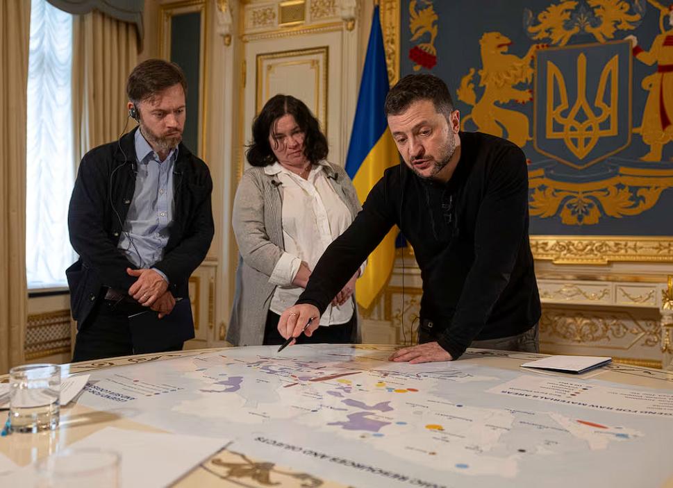 澤連斯基向記者展示烏克蘭礦產資源分佈圖 圖源:外媒