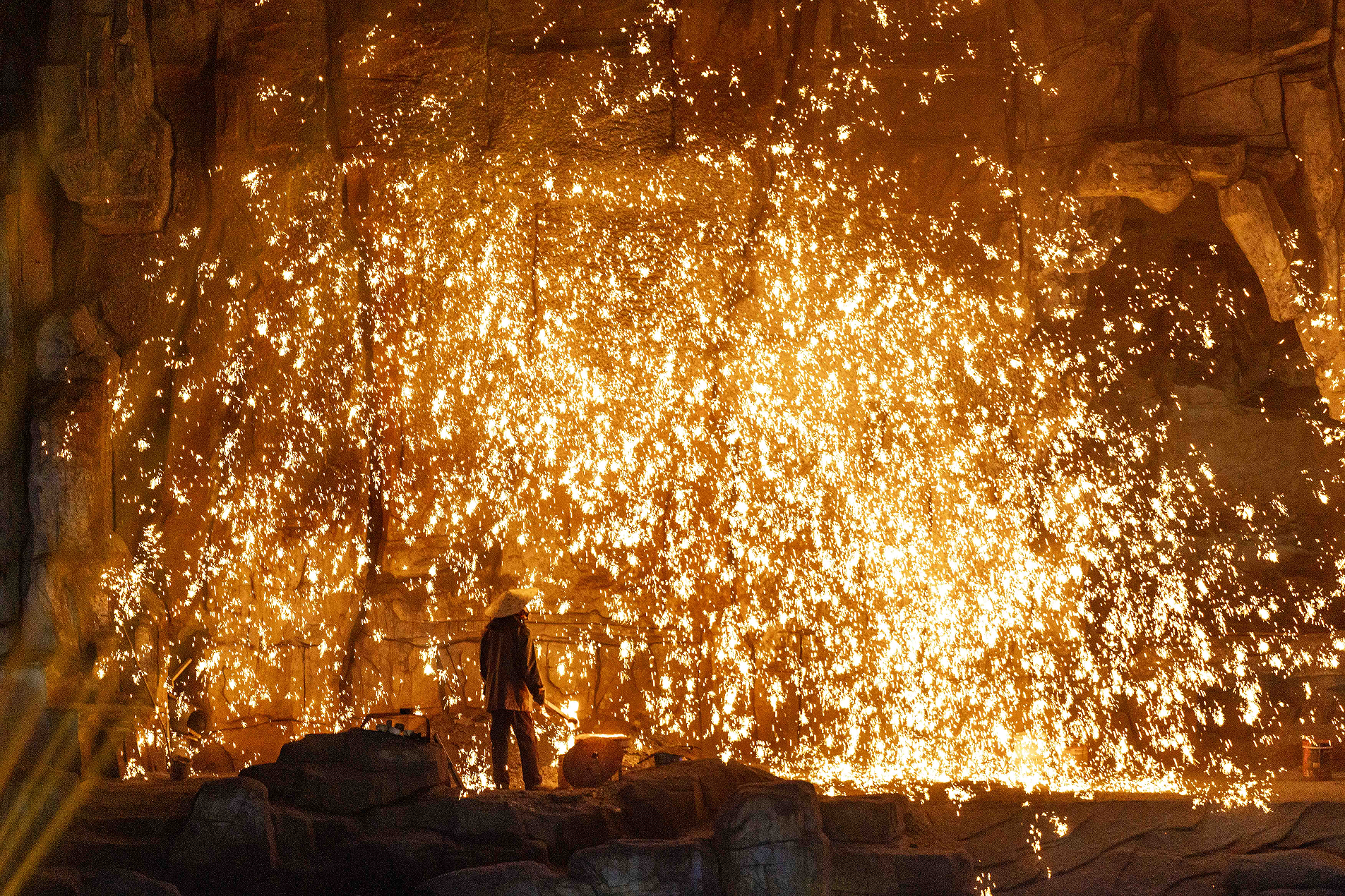 *技藝是打鐵花。*記者實地體驗了這個非遺項目——在當地打造的開闊舞台上,假山之下、人工湖旁,鐵爐熊熊,鐵水滾燙。手藝人焦國太,給記者手把手教學。