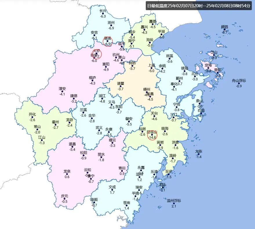 山區-6~-9℃、浙南和東南沿海地區0~-2℃、其它大部-3~-6℃。臨安仙人頂自動氣象站測得全省最低氣温,-17.8℃。