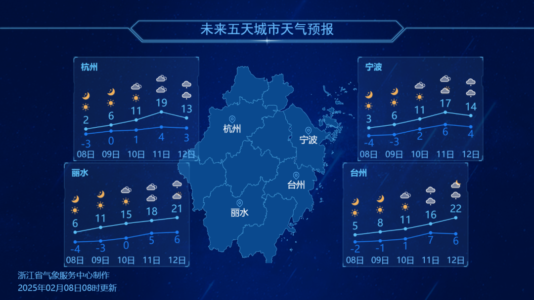 這次冷空氣來得快,去得也快。明、後天早晨再凍一凍後,10日白天開始就要明顯升温了。 浙北11日浙南12日達到本次升温頂點,多地最高氣温在20℃左右,暖洋洋又來了 。不過早晚大部仍在5℃上下,因此晝夜温差大,大家要注意及時調整着裝。