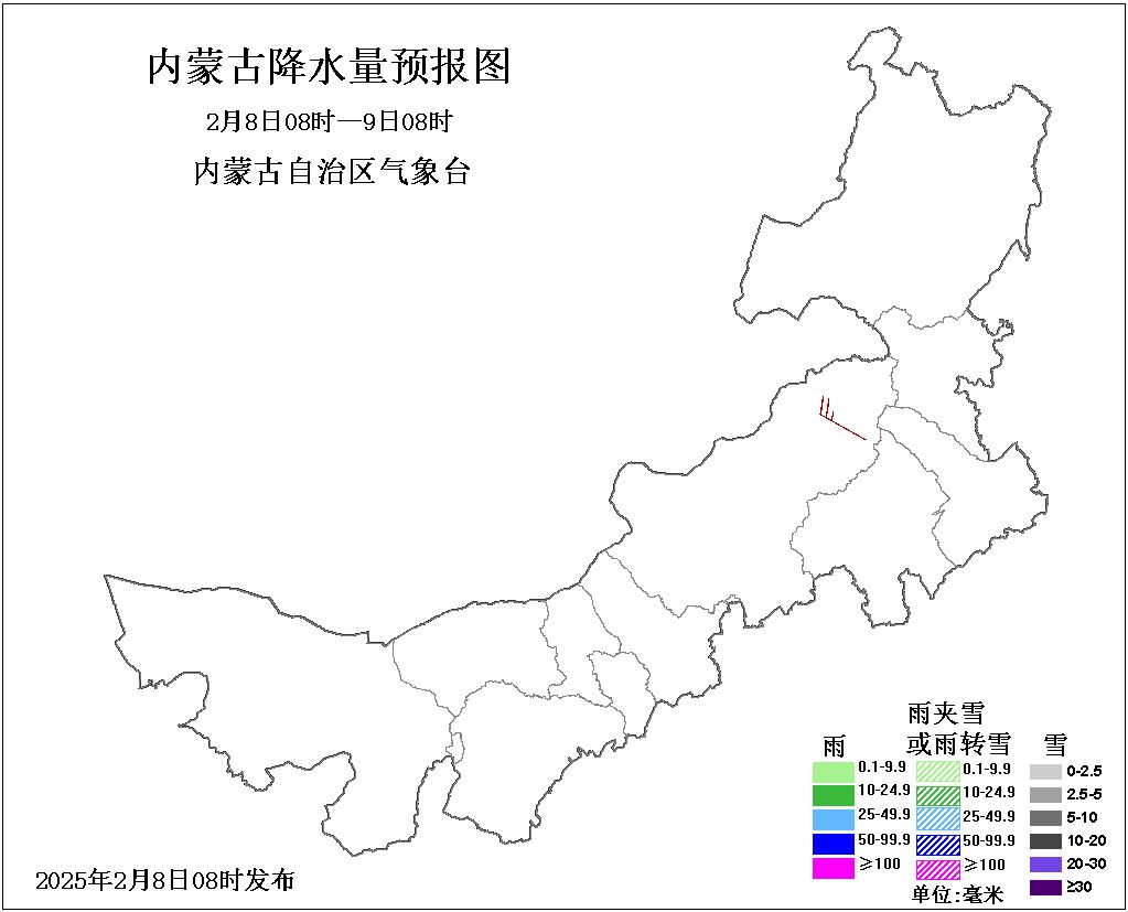 昨天,內蒙古降雪主要出現在錫林郭勒盟、通遼市、赤峯市。監測顯示,07日08時-08日08時,全區6個盟市26個旗縣的104個站點出現降雪,錫林郭勒盟西烏珠穆沁旗巴彥花鎮罕烏拉出現5.1毫米的大雪;另有2個旗縣4個站出現中雪,其中,通遼市霍林郭勒市霍林河機場4.1毫米、軍馬場管委會二連3.6毫米,錫林郭勒盟東烏珠穆沁旗烏拉蓋管理區布林分場布林泉3.8毫米;其餘26個旗縣99個站出現小雪。