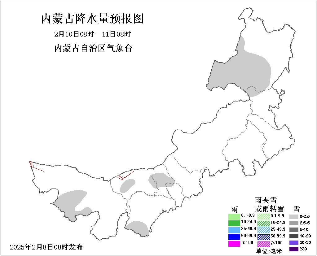 預計未來三天(2月8日至10日),內蒙古降水偏少,僅部分地區有分散性小雪,總體以晴冷乾燥的天氣為主;中部偏東、東部偏南地區多4、5級短時6、7級西北風,在冷高壓的控制下,中西部風力依然較大,局地陣風達8級並伴有沙塵天氣。氣温方面,今天,東北部偏東地區氣温下降4~6℃,局地降幅超6℃,其餘大部地區氣温開始回升。明後兩天,全區最高氣温可攀升至冰點以上。