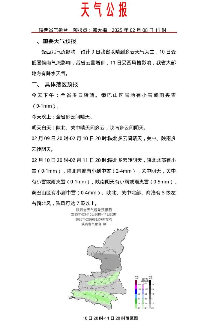陝西省氣象台2025年02月08日10時發佈未來24小時災害性天氣預報: