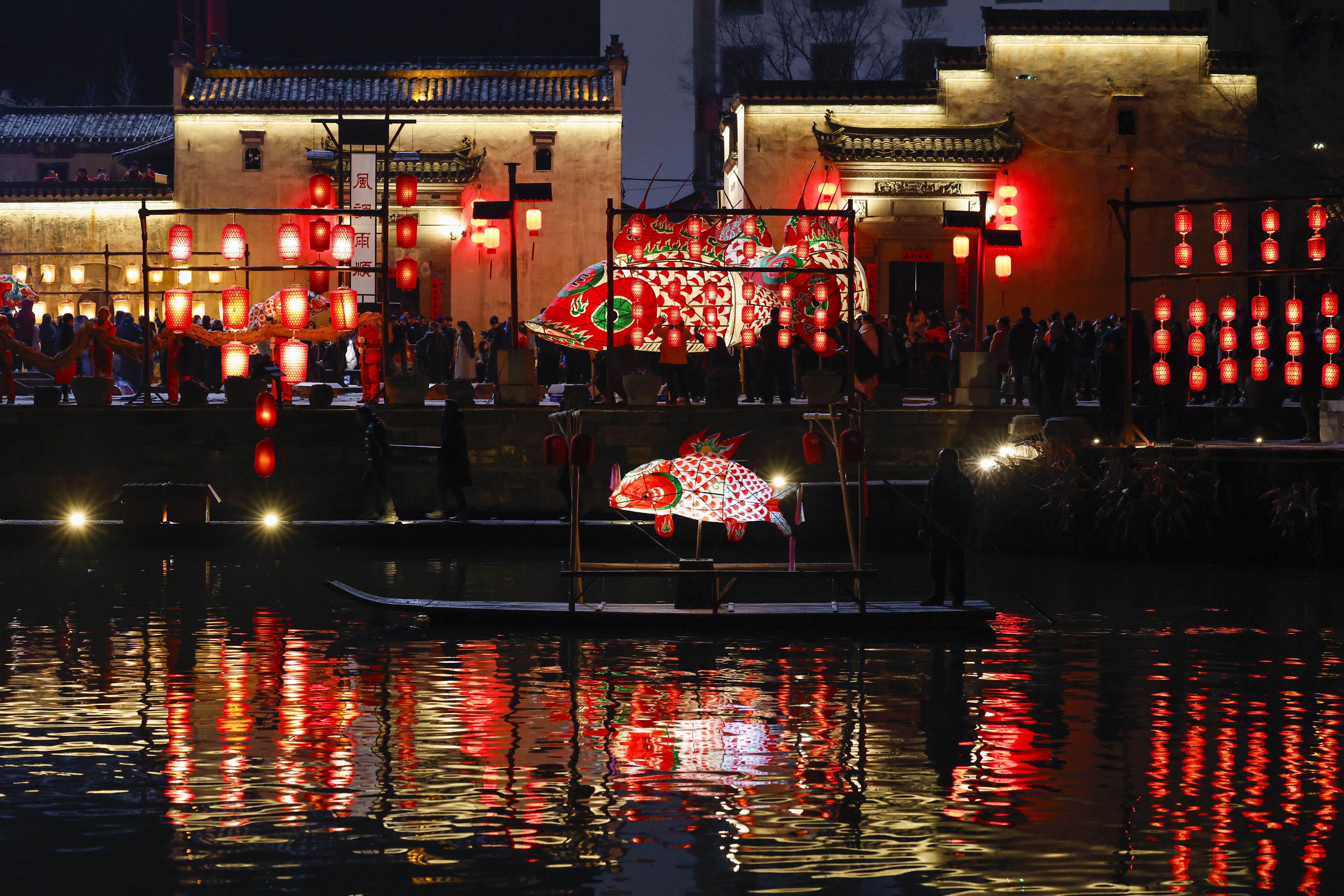 2025年1月15日,魚燈表演隊伍在安徽省黃山市徽州區呈坎村巡遊。CICPHOTO/施亞磊 攝