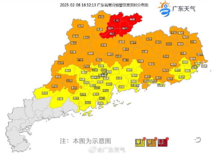 9日,廣東大部分市縣晴天。早晨最低氣温:粵北大部市縣0℃~3℃,高海拔山區零下4℃~零下1℃,珠三角北部和東部、粵東的北部3℃~5℃,雷州半島10℃~13℃,其餘市縣6℃~9℃。