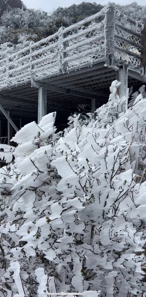 在粵北,昨天早晨連山金子山頂氣象站錄得-5℃的低温,金子山上霧凇、冰掛再現。