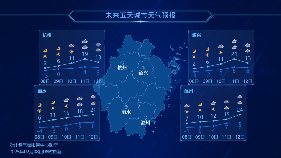 這兩天依舊寒冷,尤其是早晨,有冰凍或嚴重冰凍。好在這波冷空氣比較爽快,來得快,去得也快,10日白天開始就要明顯升温了。浙北11日浙南12日達到本次升温頂點,多地最高氣温在20℃左右,暖洋洋又來了。不過早晚大部仍在5℃上下,晝夜温差大,大家要注意及時調整着裝。