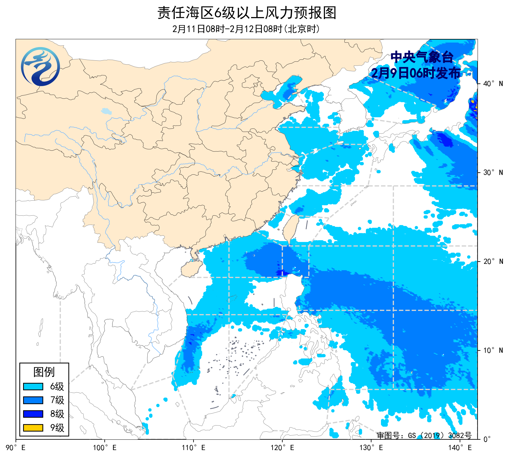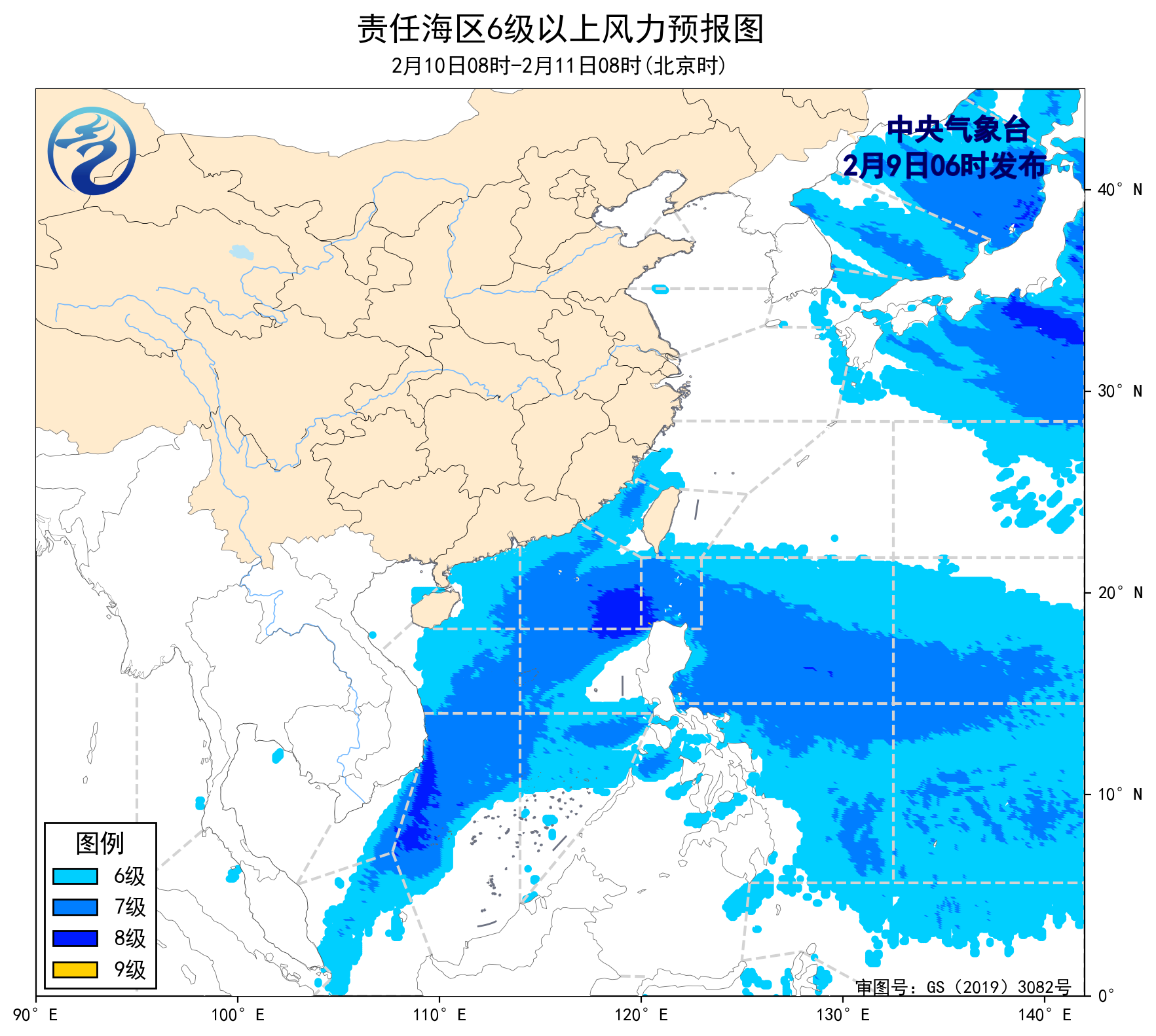 9日08時至10日08時,巴士海峽、南海中部、東北部和南海西南部海域將有6~8級、陣風9級的偏北到東北風,台灣海峽、台灣以東洋麪、南海西北部海域將有5~7級、陣風8級的東北風,東海北部海域將有4~6級、陣風7級的西北風,東海南部海域將有5~6級、陣風7級的東北風到偏北風,北部灣、瓊州海峽將有4~6級、陣風7級的偏東到東北風。為此,中央氣象台9日06時繼續發佈大風藍色預警。