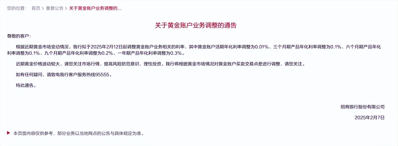 事關黃金賬户業務利率!招商銀行通告