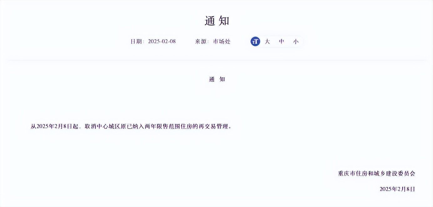 【環球網財經綜合報道】2月8日,重慶市住房和城鄉建設委員會消息,從2025年2月8日起,取消中心城區原已納入兩年限售範圍住房的再交易管理。