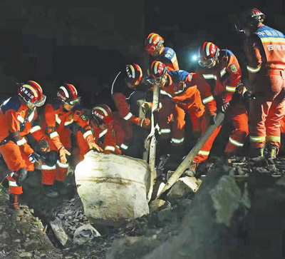 2月8日晚,在筠連縣山體滑坡現場,消防救援人員進行搜救。宋豪新 黃 超攝影報道