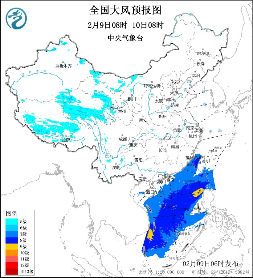 預計,2月9日08時至10日08時,內蒙古西部、新疆北部和東部、西藏中部、青海南部和東部、甘肅西部、海南島、台灣島等地的部分地區有5~6級、陣風7~8級大風;台灣海峽、巴士海峽、南海大部海域將有7~8級、陣風9級的東北風,其中巴士海峽、南海東北部、中東部和西南部的部分海域風力可達9級、陣風10級。中央氣象台2月9日06時繼續發佈大風藍色預警*(**見圖1)*。