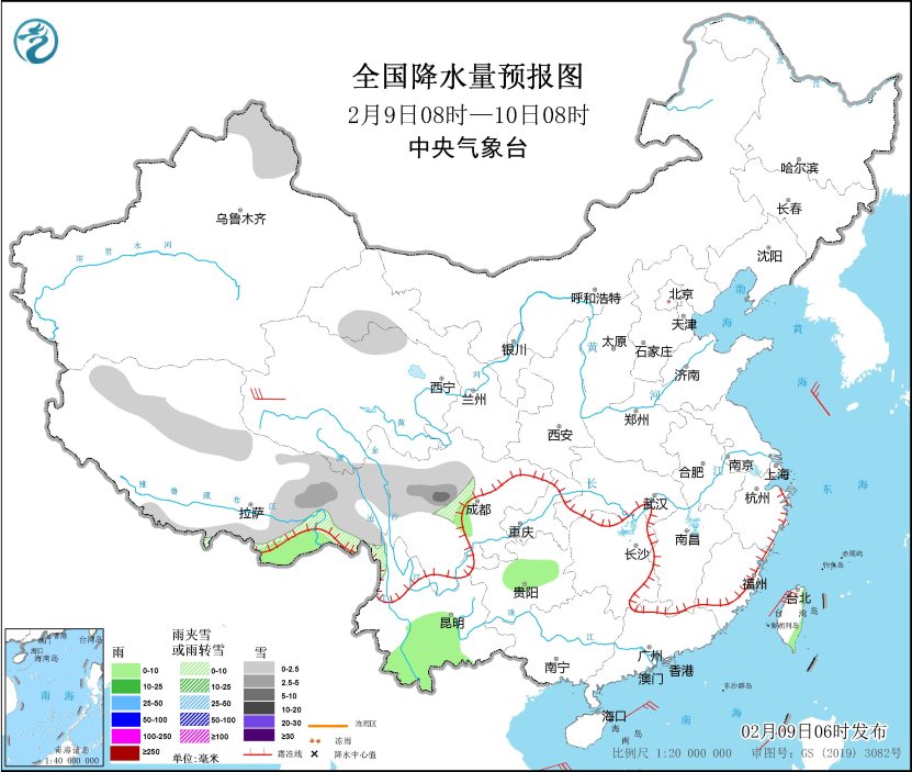 圖2 全國降水量預報圖(2月9日08時-10日08時)