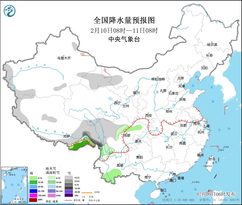 *2月10日08時至11日08時,*內蒙古西部、甘肅西部、西藏東部、川西高原、雲南西北部等地部分地區有小到中雪或雨夾雪,其中,西藏東南部等地部分地區有大到暴雪。西藏東南部、雲南南部等地部分地區有小到中雨。內蒙古西部、新疆北部和東部、甘肅中西部等地部分地區有4~6級,陣風7~8級大風(見圖3)。