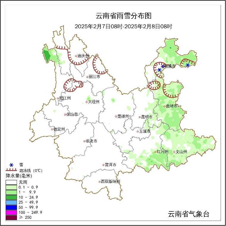 怒江州北部、迪慶州西部的高海拔地區陰有中到大雪,迪慶州西部陰有雨夾雪或小雪,怒江州南部、麗江市北部陰有分散小雨,昭通市北部陰,其他地區晴間多雲。