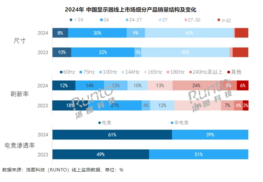 值得一提的是,電競產品無疑是2024年中國顯示器線上市場競爭的新高地。2024年全年,中國線上電競顯示器市場的銷量為609萬台,同比增長38.5%,增速遠高於大盤;電競產品的滲透率由2023年的49%上升至61%,增長了12個百分點。(思瀚)