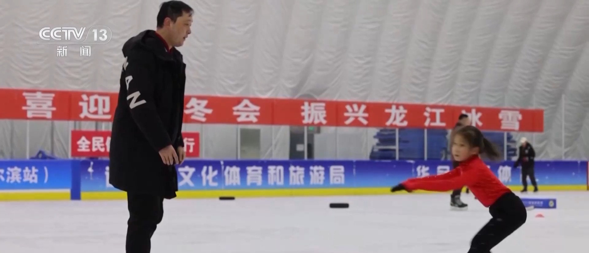 熱鬧的地方可不只在冰雪大世界,在一家冰上運動氣膜館,雖然已經是夜晚,但是館內依舊人聲鼎沸,在公益免費的時段,附近的居民羣眾都可以來到這裏滑冰、打冰球。這裏還會安排學校的冰雪運動培訓課程,孩子們在教練的指導下認真學習滑冰技巧。同時,這裏還經常舉辦夜間冰雪運動賽事,吸引眾多冰雪運動愛好者參與。