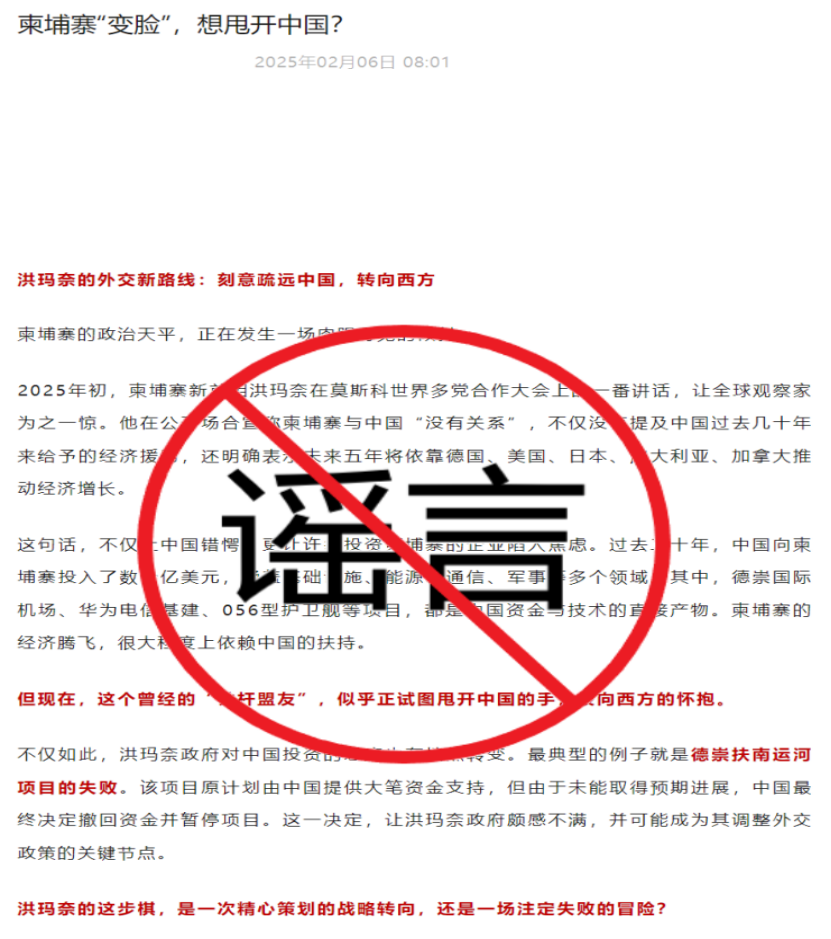 近來,少數自媒體發佈所謂柬埔寨領導人在中美之間選邊站隊、中柬大項目合作受阻等不實言論,對中柬關係進行無端造謠攻擊和惡意中傷。為戳穿虛假信息、釐清事實真相,中國駐柬使館設立“關於中柬關係的謠言與真相”專欄,幫助廣大網友辨別真偽、免受誤導。