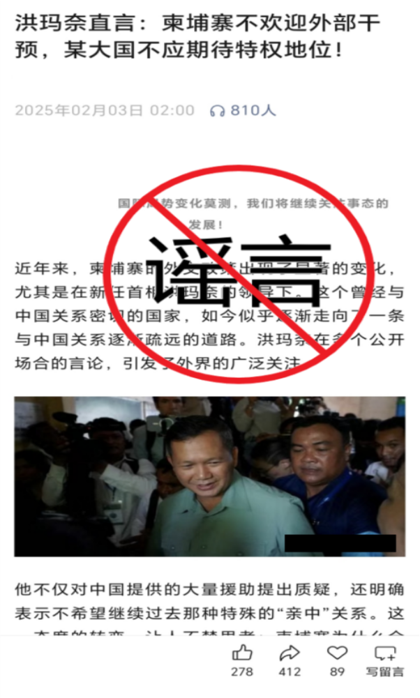 真相: 洪瑪奈首相從未發表過類似言論。洪瑪奈首相多次重申柬中是鐵桿朋友,將致力於推進柬中友好關係。他不久前向中國領導人致春節賀信,對中國政府長期以來給予柬方的堅定支持和寶貴援助表示衷心感謝,並指出,中國的支持為柬社會經濟發展作出重要貢獻。