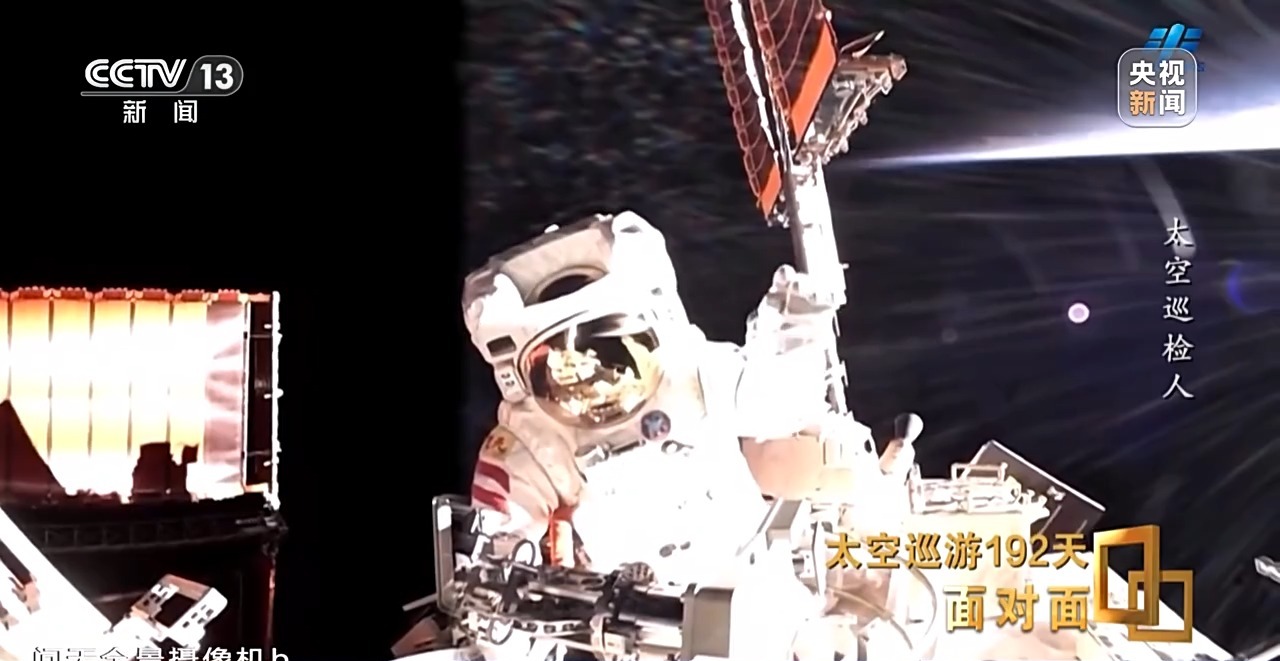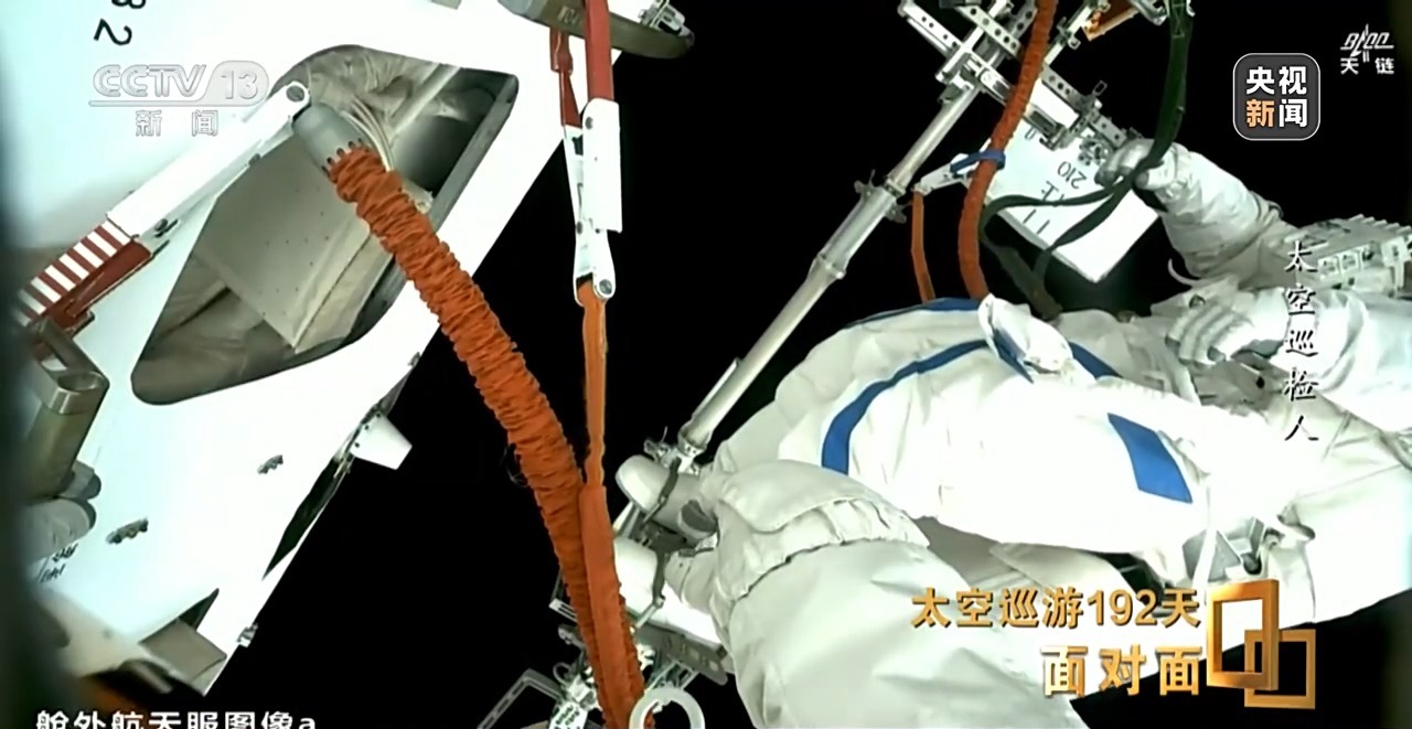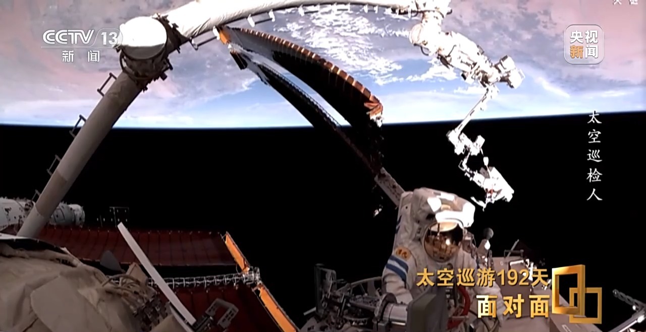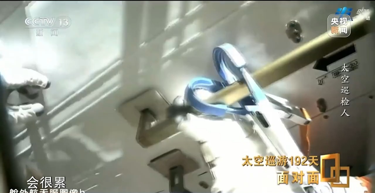 *李廣蘇:*爬時間久了之後手很累,因為手腕這塊一直在持續地在發力,持續時間長了之後,需要停下來休息休息,再繼續進行轉移。特別是到了陰影區,陽照區還好,陽照區能看見空間站,包括地球看着比較踏實,比較安心。但是到了陰影區以後,你要不開燈,你就感覺下面深不見底,深邃的那種黑。