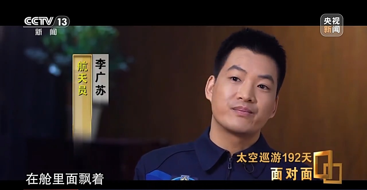 *李廣蘇:*告別儀式結束的時候,我是第一個離開空間站去神舟十八號飛船的,當時整個人從飄着,離開核心艙,到了節點艙以後,我往兩邊一看,再看一看兩個實驗艙,再回頭看一看自己工作生活了192天的空間站,心裏邊會有一種莫名的酸楚,有一種想哭的衝動,忍着淚水沒敢看第二眼。