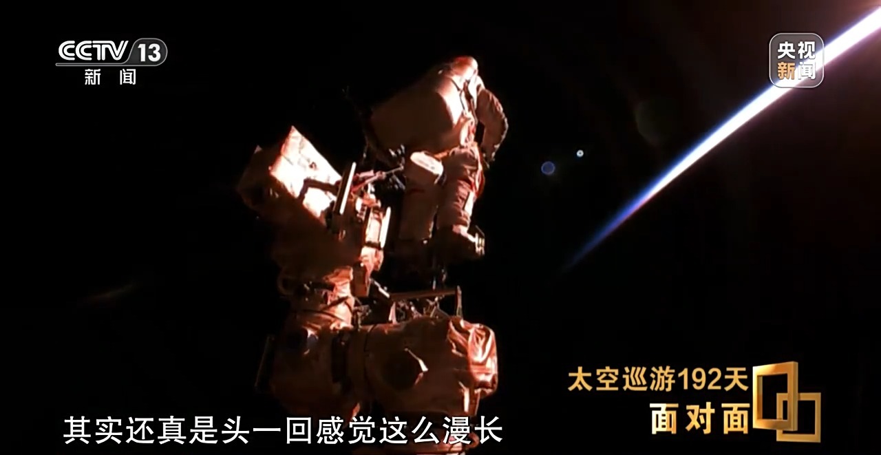 *葉光富:*第一次出艙全程8.5個小時,在外面作業其實還真是頭一回感覺這麼漫長,時間過得這麼久,就是一會兒陽照,一會兒陰影,過了四五個至少。隨着時間的推移,你就能發現在地球的一側,慢慢出現一條弧形的亮帶,而且在中間某個點就有一個紅色的亮點就會越來越大,形成亮斑,這就是太陽。這束光透過面窗,照到你的臉上,説實話也照到你的心裏了,就那會兒感覺,這一束光不光帶來了温暖,在黑暗中也帶來了希望。