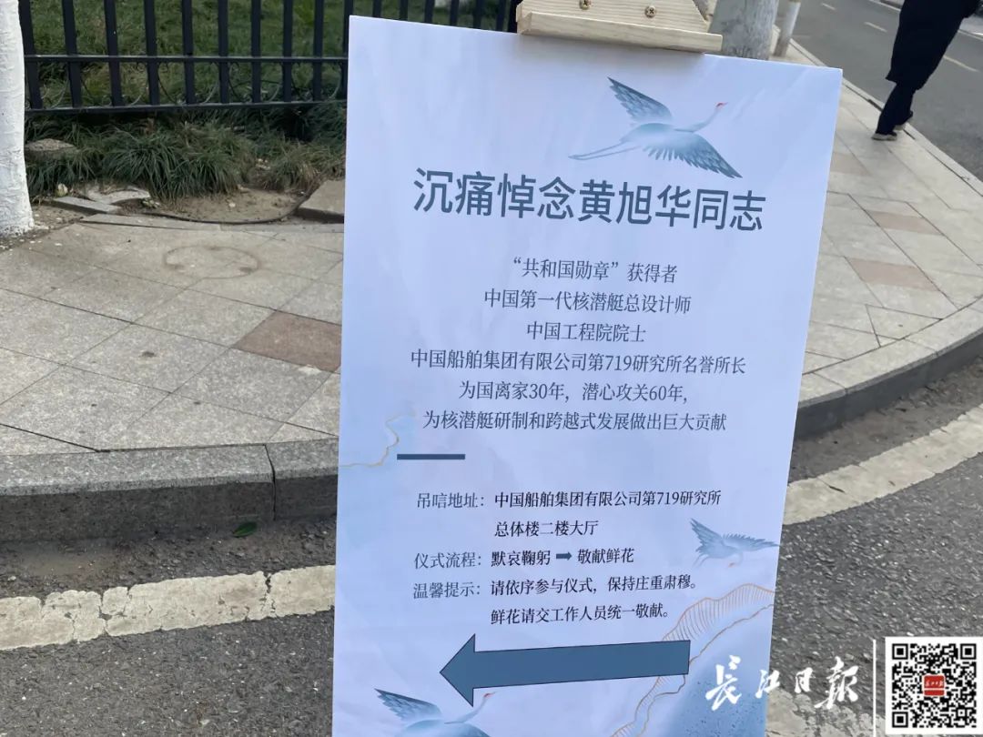 上午10時許,長江日報記者從張之洞路下車,拐過幾棟有着花崗岩圍牆的老宿舍樓,再經過一個小廣場,看到弔唁入口處一塊不及腰高的提示牌,上面寫着:沉痛悼念黃旭華同志。