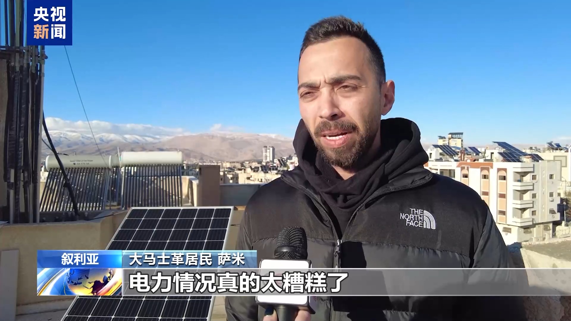 *大馬士革居民 薩米:*電力情況真的太糟糕了,電一天最多隻來一兩個小時,所以我們不得不安裝太陽能系統。但即便如此,也僅夠給手機、筆記本電腦充電,或者點亮幾盞燈,有時候勉強能開電視。但通常到了晚上,電力仍然不夠用。