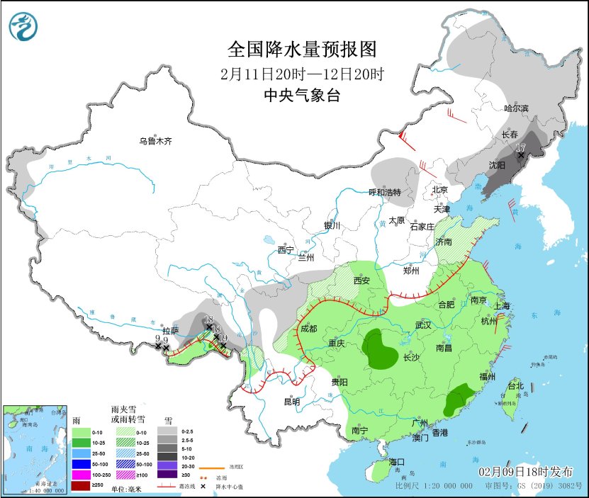 *2月10日20時至11日20時,*新疆西部、甘肅河西、西藏東部、川西高原中部和南部、內蒙古東北部、黑龍江中西部、寧夏南部、陝西中北部、山西中北部、山東西南部等地部分地區有小雪或雨夾雪,其中,西藏東南部、甘肅東部等地部分地區有中到大雪(5~9毫米)。西藏東南部、雲南西北部、四川盆地北部、河南大部、湖北北部、安徽中北部、江蘇大部、廣西中部等地部分地區有小雨。內蒙古西北部、遼東半島、青海南部等地部分地區有5~7級風,巴士海峽、台灣海峽、南海大部等海域有有6~7級風(見圖3)。