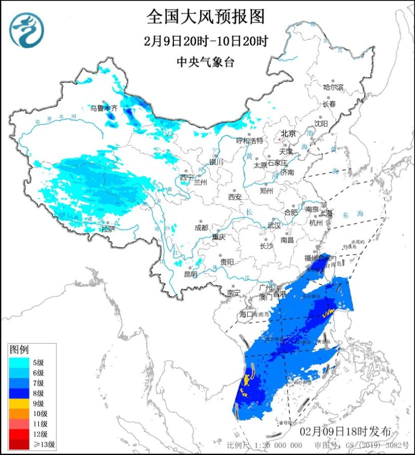 預計,2月9日20時至10日20時,新疆東部、西藏中北部、青海西南部、內蒙古西北部的部分地區有5~6級、陣風7~8級大風,其中,新疆東部山口地區風力可達7~8級、陣風9~11級;台灣海峽、台灣以東洋麪、巴士海峽、南海大部海域將有7~8級、陣風9級的東北風,其中巴士海峽、南海東北部、中東部和西南部的部分海域風力可達9級、陣風10級。中央氣象台2月9日18時繼續發佈大風藍色預警*(**見圖1)*。